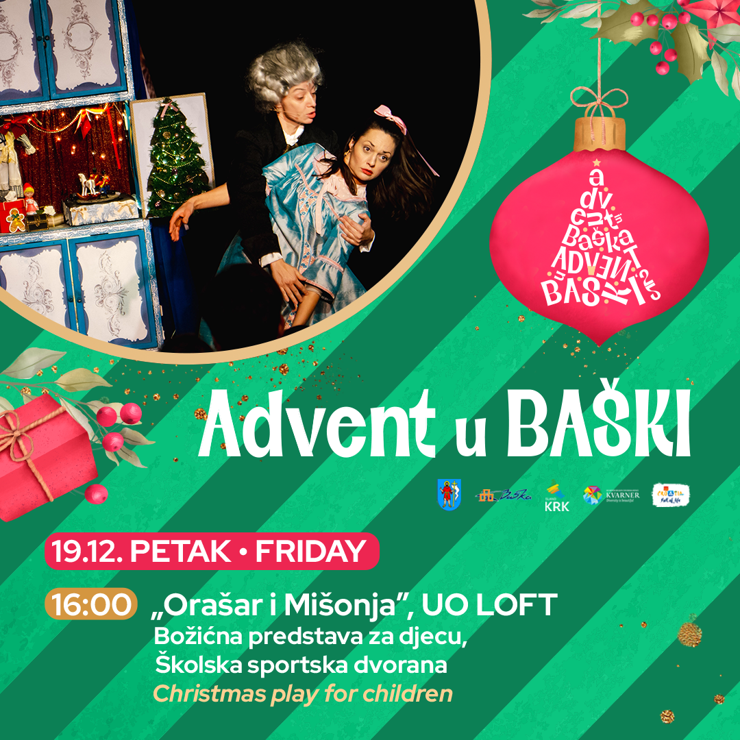 Petak, 19. prosinca, donosi sadržaj namijenjen cijeloj obitelji. U poslijepodnevnim satima najmlađe očekuje božićna predstava "Orašar i Mišonja" u izvedbi Umjetničke organizacije LOFT, koja će se održati u školskoj sportskoj dvorani. Riječ je o toploj i razigranoj predstavi koja djecu uvodi u blagdansku priču kroz glumu, glazbu i prepoznatljive motive Božića.