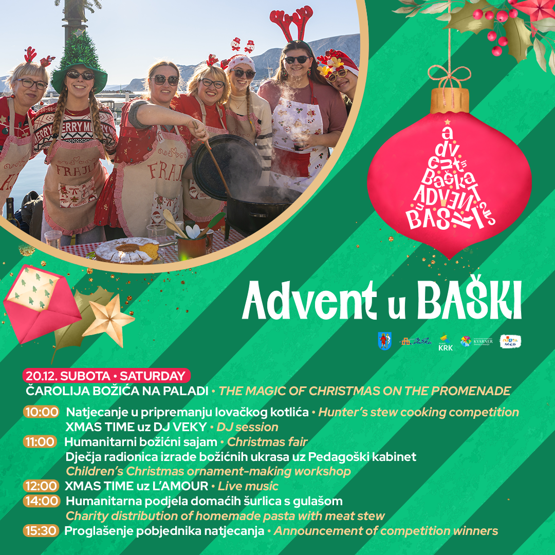 Ovogodišnji Advent u Baški započeo je svečanim paljenjem prve adventske svijeće, uz program koji je okupio mještane i goste te najavio blagdansko razdoblje ispunjeno susretima i zajedništvom. U danima koji su uslijedili, adventski ritam oblikovali su dolazak svetog Nikole i dječja radost, kreativne radionice za najmlađe, ali i večernje radionice za odrasle, osmišljene kao opuštena i inspirativna blagdanska iskustva. Djeca su kroz igru i stvaranje izrađivala vlastite božićne ukrase i slastice, dok su odrasli uživali u kreativnom radu uz tople napitke i ugodnu atmosferu. Glazbeni programi uz adventsku kućicu dodatno su obogatili prosinačke večeri, a njegovanje lokalnih običaja Adventu u Baški dalo prepoznatljiv karakter koji spaja tradiciju i suvremeni blagdanski ugođaj.