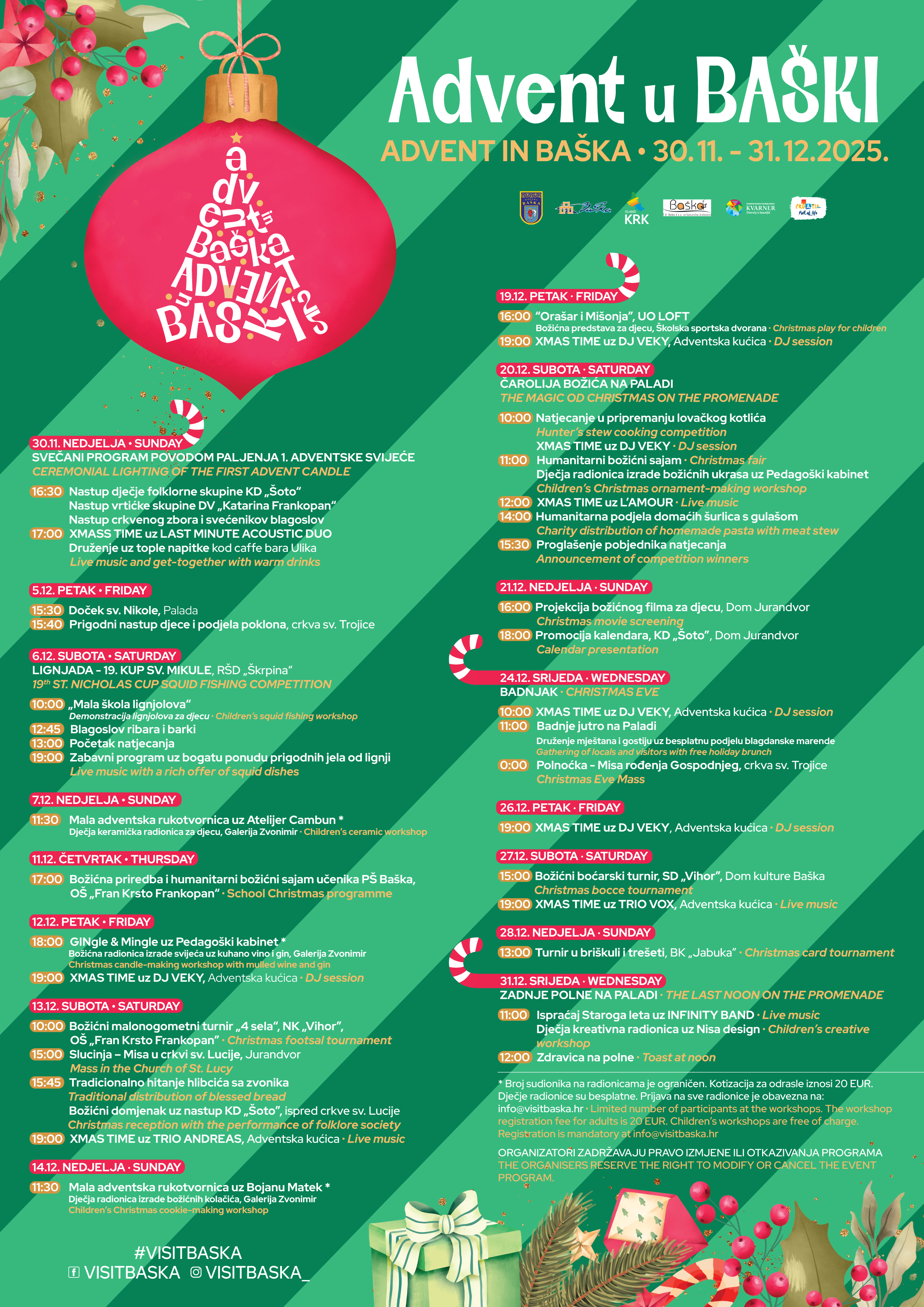 Najmlađi posjetitelji i ove godine uživat će u razigranom i posebnom programu. U petak, 5. prosinca, Sveti Nikola tradicionalno stiže brodicom na Paladu, gdje će ga djeca dočekati pjesmom i recitacijama koje su pripremila s velikim veseljem. Općina Baška osigurala je poklone za svu djecu s područja općine, čineći ovaj susret još radosnijim. U četvrtak, 11. prosinca, predblagdansko vrijeme u OŠ "Fran Krsto Frankopan" ispunjava tradicionalna božićna priredba u kojoj učenici pjesmom i recitacijama unose radost i toplinu u školsku dvoranu, dok se istovremeno na humanitarnom sajmu učeničkih radova mogu pronaći unikatne dekoracije i pokloni uz priliku da se učini dobro djelo. Veseli prosinački program nastavlja se 19. prosinca kazališnom predstavom "Orašar i Mišonja", maštovitom verzijom poznate božićne priče koja kroz lutkarsko-glumačku igru, maske i kazalište predmeta oduševljava i djecu i odrasle. U nedjelju, 21. prosinca, u Domu Jurandvor prikazuje se božićni film, nakon čega slijedi promocija kalendara u organizaciji KD "Šoto", savršena za pronalazak posljednjih sitnica za ispod bora.