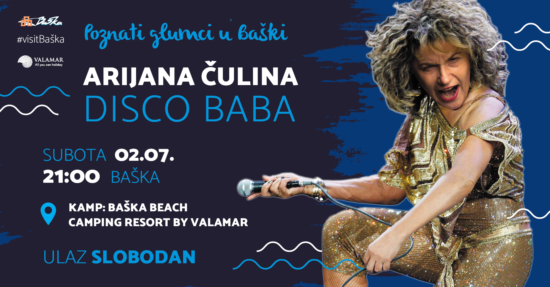 U suradnji sa Valamarom u Baška Beach Camping Resortu već ove subote, u sklopu programa Poznati glumci u Baški, imamo priliku zabaviti se uz mono komediju 'DISCO BABA', napisanu već prepoznatljivim rukopisom Arijane Čuline. Na sebi svojstven način, duhovito i bez dlake na jeziku, ova renomirana glumica i spisateljica progovara o tome kako danas kao da je zabranjeno ostariti.