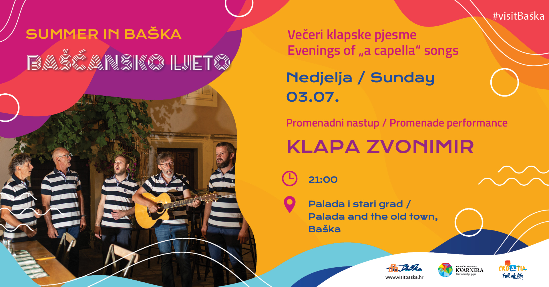 Neizostavni dio turističke ponude Baške su i promenadni nastupi klapa koje će ovo ljeto uljepšati nedjeljne Večeri klapske pjesme u manjim ulicama i trgovima u starom dijelu Baške te tako obradovati namjerne ili slučajne prolaznike.