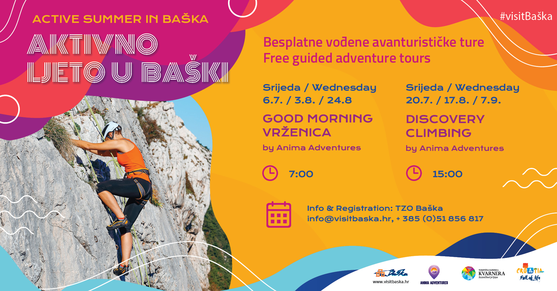 Kako bi raznoliku outdoor ponudu Baške na što organiziraniji i sigurniji način približili našim posjetiteljima te im omogućili aktivni odmor i ljeti, ove godine predstavljamo i Aktivno ljeto u Baški koje će uključivati biking, hiking i climbing izlete organizirane uz potporu naših outdoor suradnika!