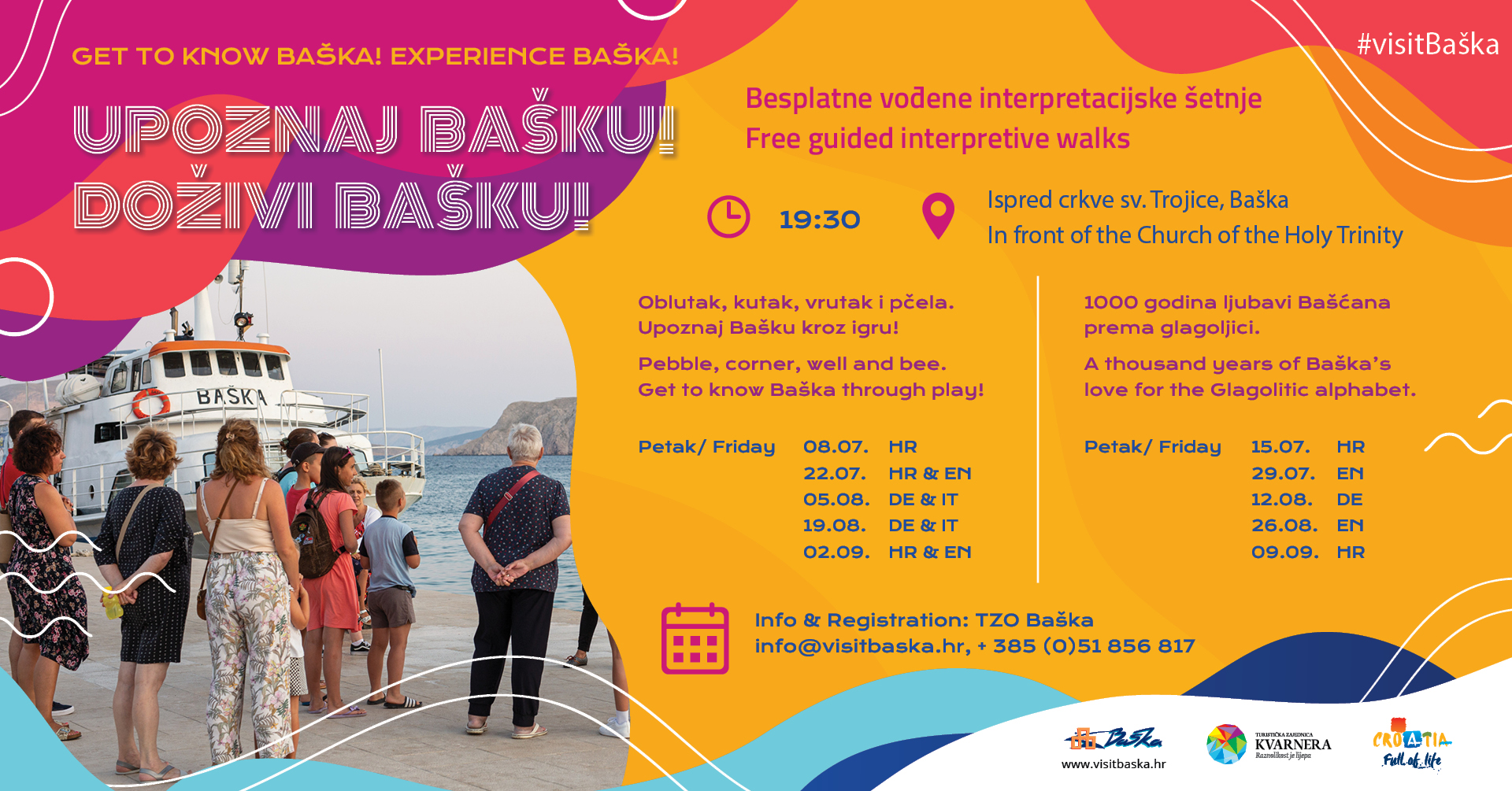 I ovo ljeto nastavljamo sa serijom interpretacijskih šetnji Upoznaj Bašku! Doživi Bašku!, a u sklopu kojih se upoznaju pojedini dijelovi bašćanske doline s naglaskom na kulturnu i prirodnu baštinu.