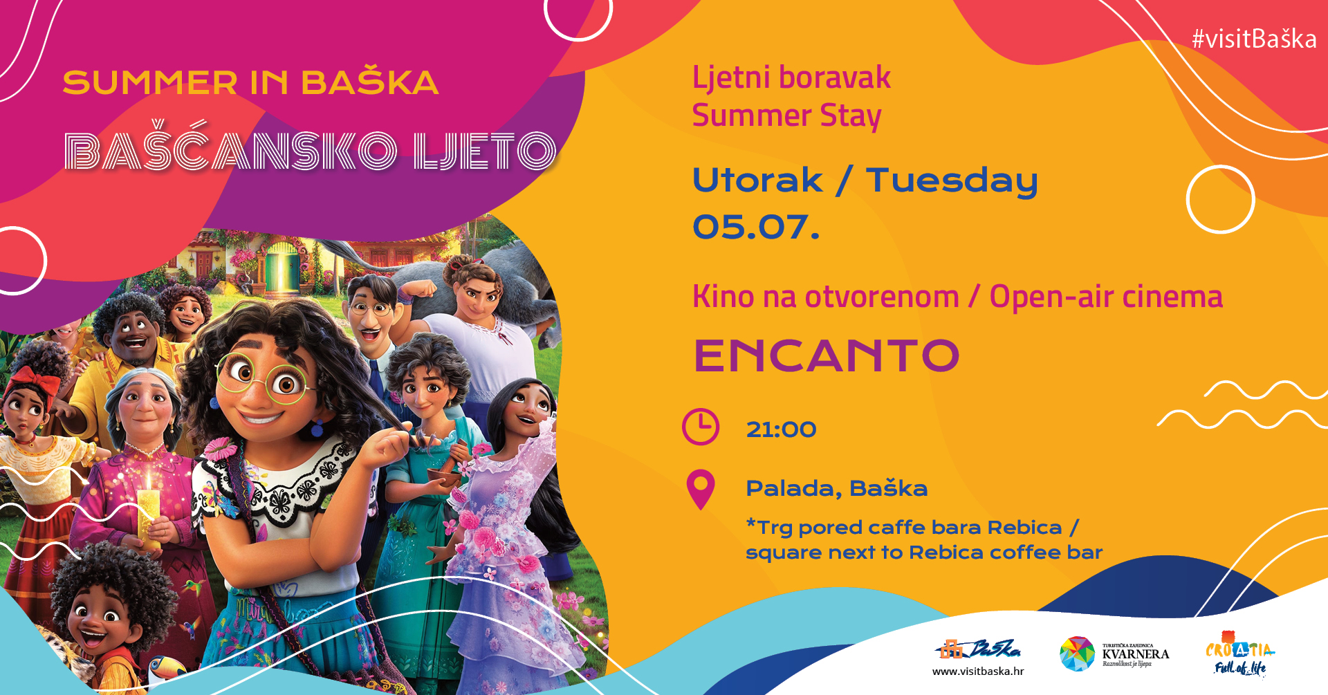 Ni ove godine nismo zaboravili na najmlađe koje će ovog ljeta, u sklopu programa Ljetnog boravka, uživati u večernjim kino projekcijama na otvorenom te brojnim kreativnim radionicama. Turistička zajednica općine Baška poziva sve zaljubljenike u filmove da pogledaju novi Disneyjev Oscarom nagrađeni animirani film – Encanto: Naš čarobni svijet.
