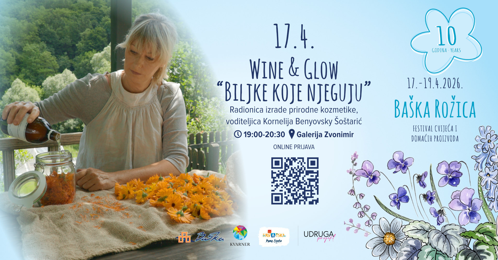 Pod vodstvom Kornelije Benyovsky Šoštarić, poznate TV vrtlarice i autorice knjige "Biljke koje njeguju", naučit ćete kako biljke, ulja i prirodni sastojci mogu postati dio vaše svakodnevne rutine njege. Diplomirana inženjerka hortikulture i dugogodišnja urednica emisije "Vrtlarica", Kornelija već godinama prenosi znanje o organskom pristupu životu, a na ovoj radionici kroz praktičan rad izrađivat ćete vlastite maske i balzame te usvojiti jednostavne recepte koje možete primjenjivati kod kuće. Trajanje radionice je 1,5 do 2 sata, cijena iznosi 40 €, a svi materijali, kao i vino i grickalice, uključeni su u cijenu. Broj mjesta je ograničen i prijava je obavezna putem obrasca.