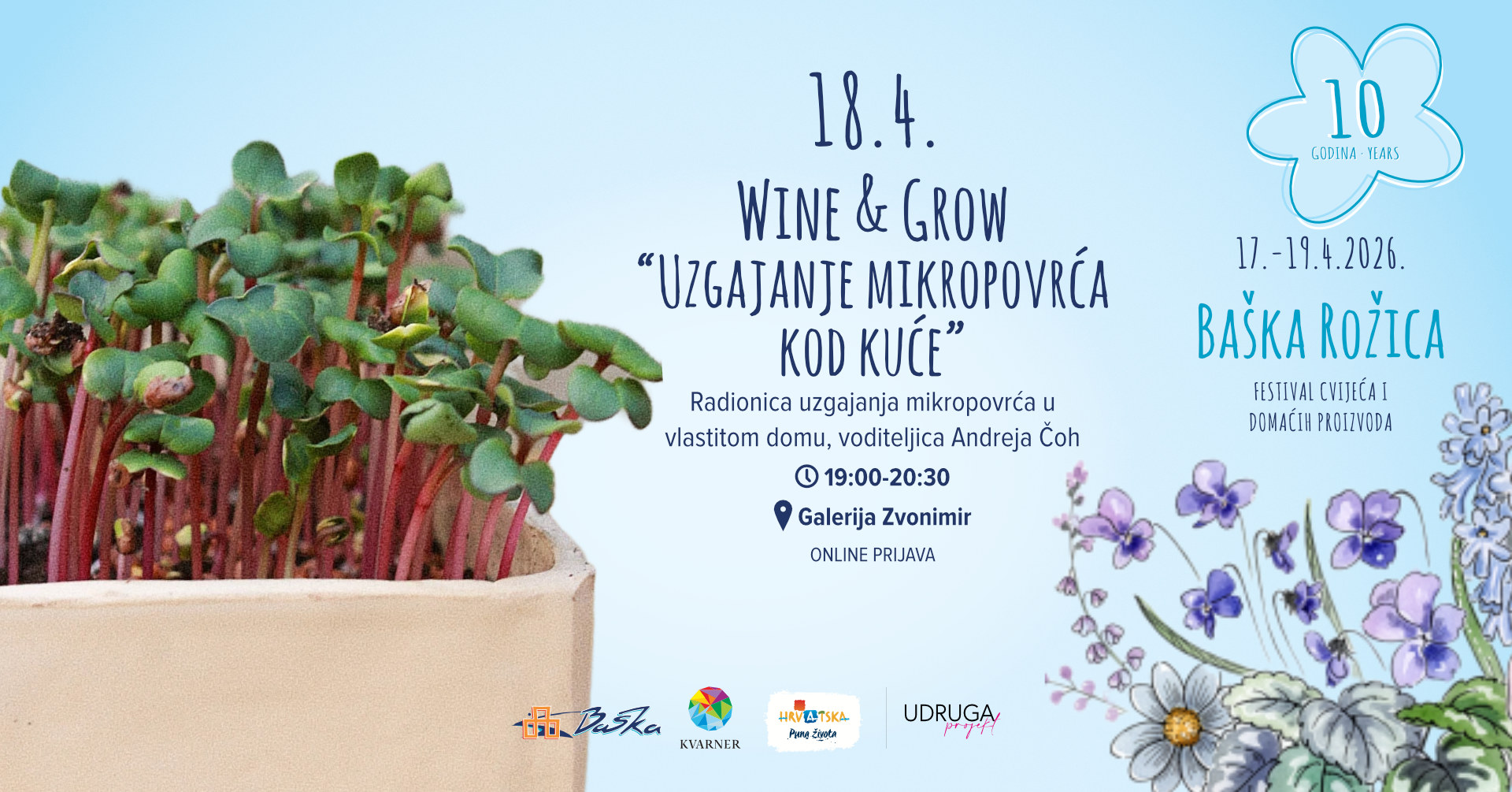 U večernjim satima Galerija Zvonimir ponovno postaje mjesto susreta svih ljubitelja prirode, zdravog načina života i održivog uzgoja kroz radionicu Wine & Grow "Uzgajanje mikropovrća kod kuće", pod vodstvom Andreje Čoh, poznate i kao Zelena Andreja, koja promiče održiv način života i urbano vrtlarstvo. Radionica započinje u 19:00 sati te traje 1,5 do 2 sata. Kroz opušteno i praktično iskustvo sudionici će naučiti kako jednostavno uzgojiti vlastitu, nutritivno bogatu "superhranu" kod kuće. Radionica uključuje degustaciju različitih vrsta mikropovrća te niz praktičnih savjeta kako započeti i nastaviti uzgoj kod kuće, bez obzira na prethodno iskustvo.